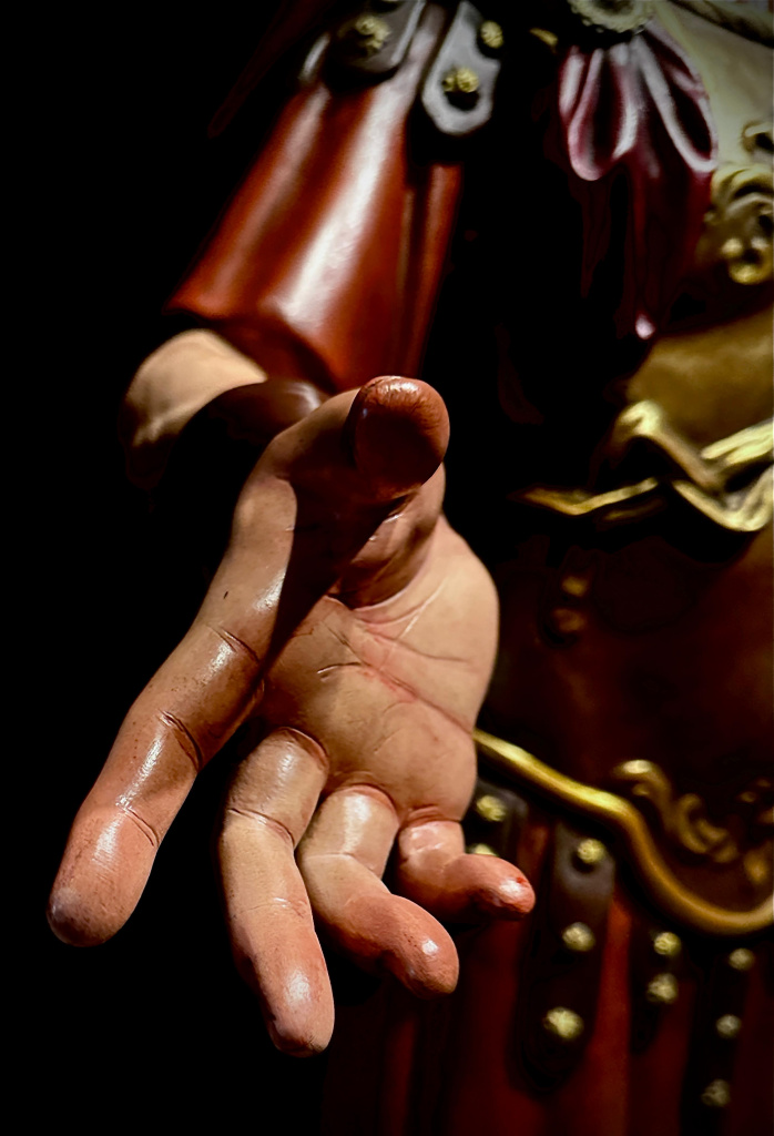 La escena completa alcanza este año su plenitud con la incorporación de la última imagen del conjunto que representa a un centurión romano con actitud burlesca, cuya mirada desafiante se posa sobre el rostro de Jesucristo crucificado. Con esta nueva talla, el paso adquiere una dimensión más completa en la narrativa visual del Calvario, enmarcando con mayor fuerza el mensaje de perdón y misericordia que encierra esta Primera Palabra.