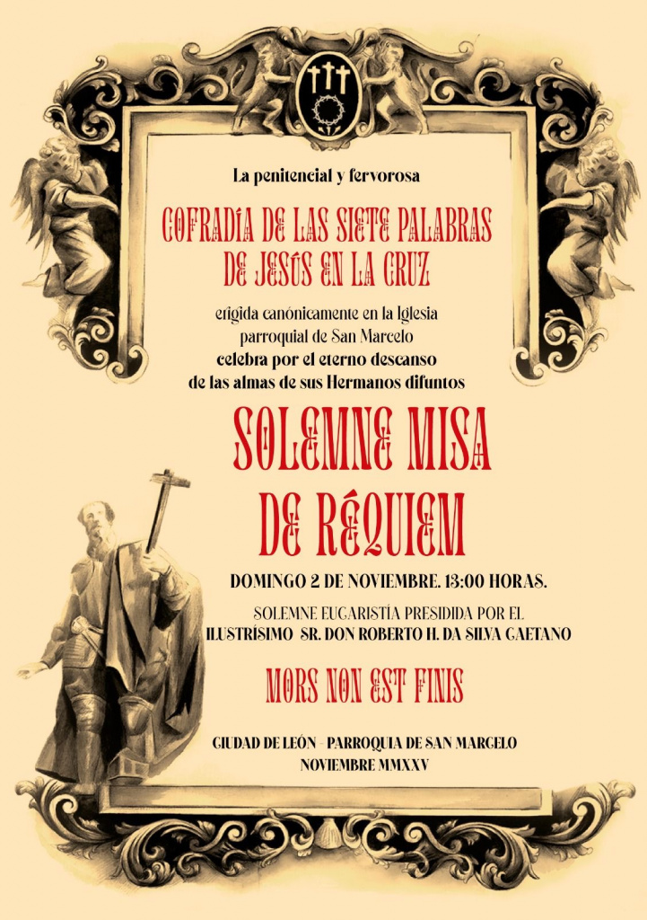 La Cofradía de las Siete Palabras de Jesús en la Cruz celebrará el próximo domingo 2 de noviembre a las 13:00 horas, solemne misa de Réquiem, por el eterno descanso de las almas de sus Hermanos difuntos. En especial por aquellos que han fallecido en este ultimo año.