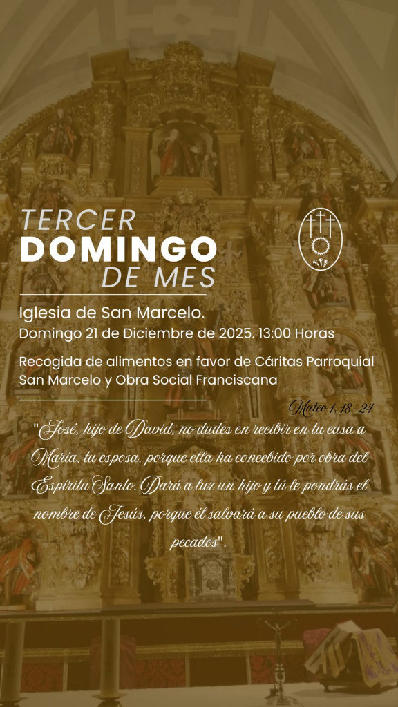 Mañana 21 de diciembre, celebramos la Eucaristía del tercer domingo de mes en nuestra sede canónica de la Iglesia Parroquial de San Marcelo, como es tradición en nuestra Cofradía.