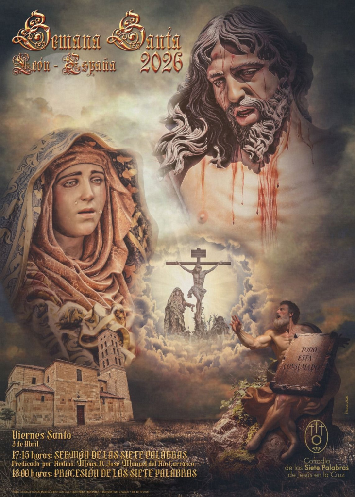 Cartel para el Sermón y Procesión de las Siete Palabras del Viernes Santo 3 de Abril, obra de Seba Cervantes.