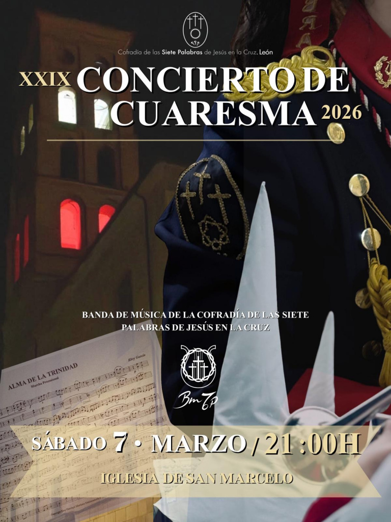 El Sábado 7 de Marzo se celebrara el vigésimo noveno concierto de Cuaresma a cargo de la Banda de Musica de la Cofradía de las Siete Palabras de Jesús en la Cruz.